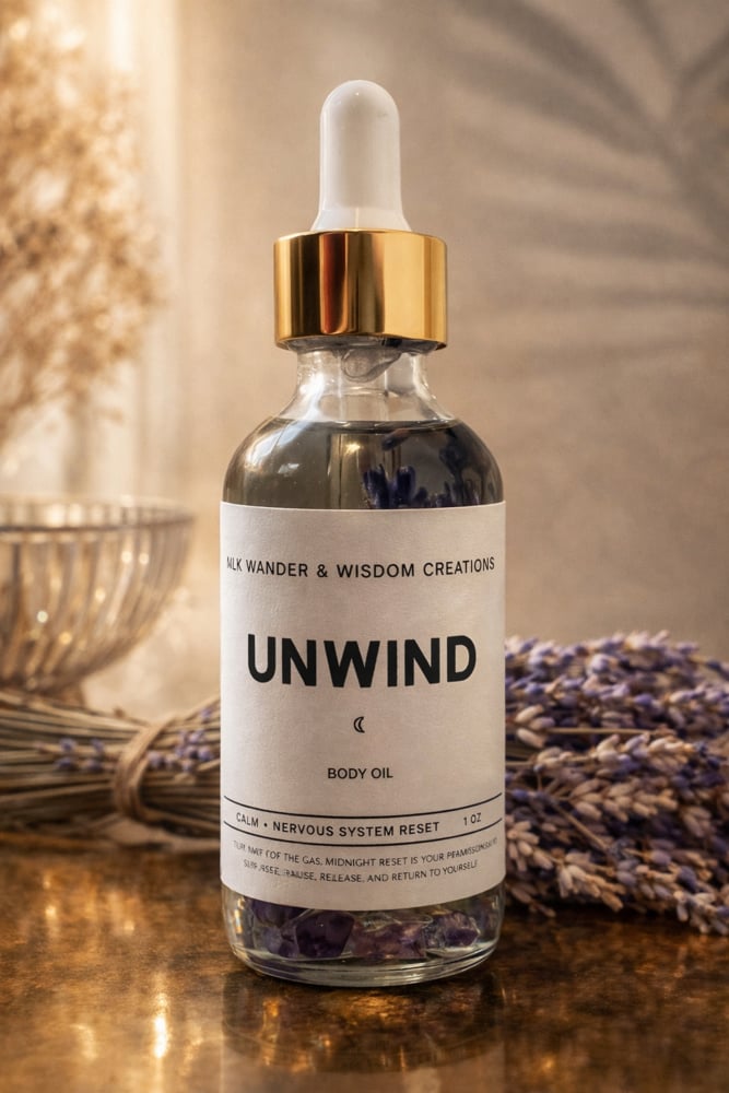 Unwind is your permission to slow down, soften, and return to yourself. Designed to calm the nervous system and ease tension, this oil helps you transition out of overwhelm and into peace.